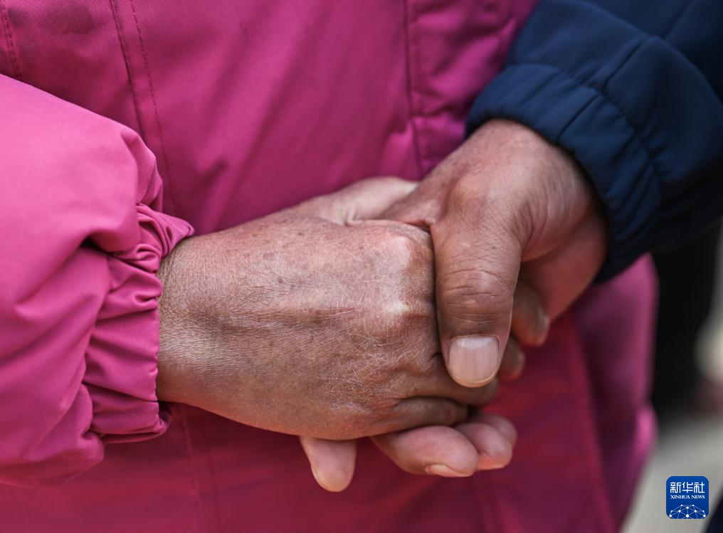 2023年12月31日,在江苏省常州市溧阳市埭头镇田螺圩村,李永握住史八妹的手。