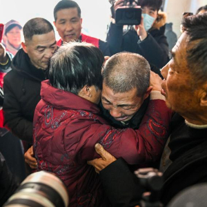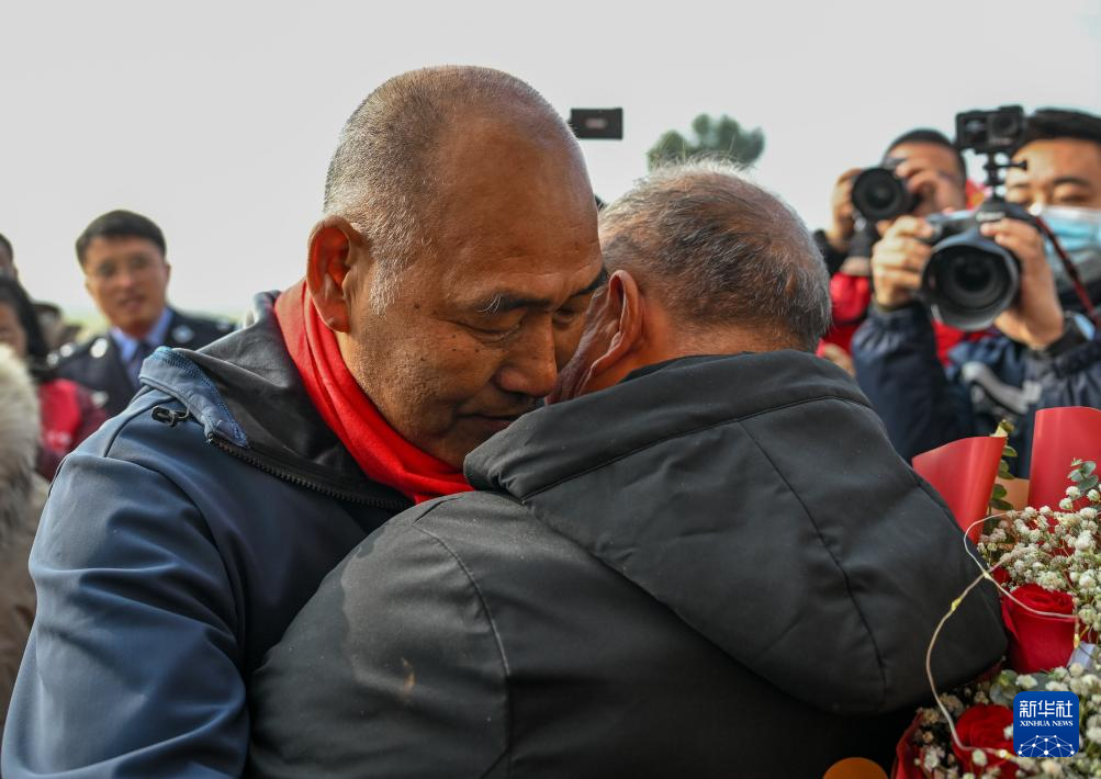 2023年12月31日,在江苏省常州市溧阳市埭头镇田螺圩村,李永与亲人拥抱。