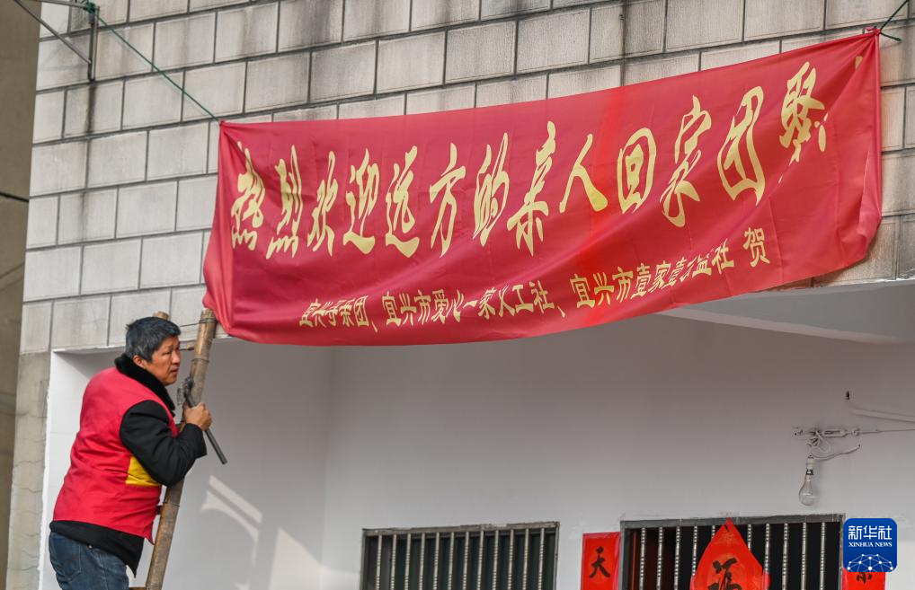 1月1日,在江苏省无锡宜兴市徐舍镇虞家桥村,李世英的家人悬挂条幅欢迎他回家。