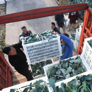1月3日,在浙江省宁海县胡陈乡海航家庭农场,来自四川凉山彝族自治州的务工人员将采收的西兰花装车。