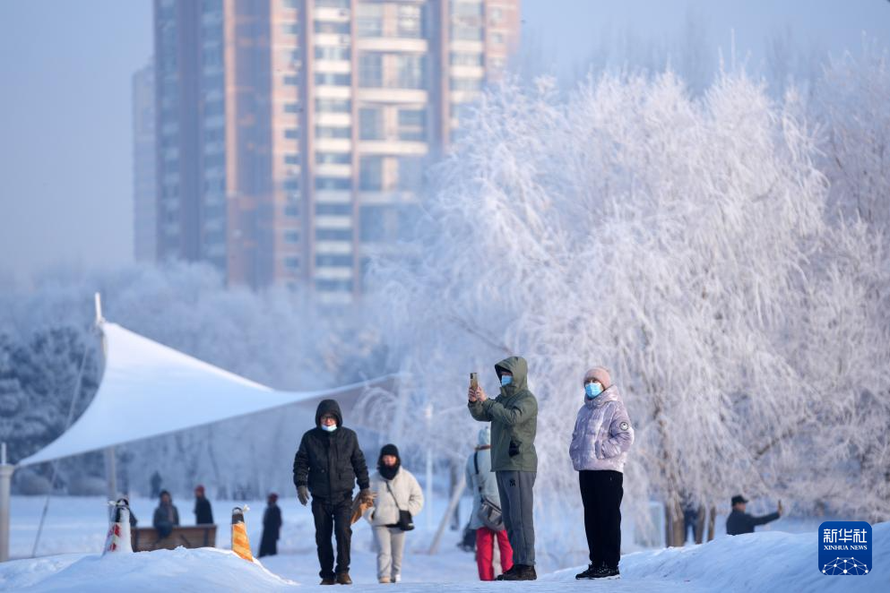 1月3日,市民在哈尔滨市湘江公园欣赏、拍摄雾凇景观。