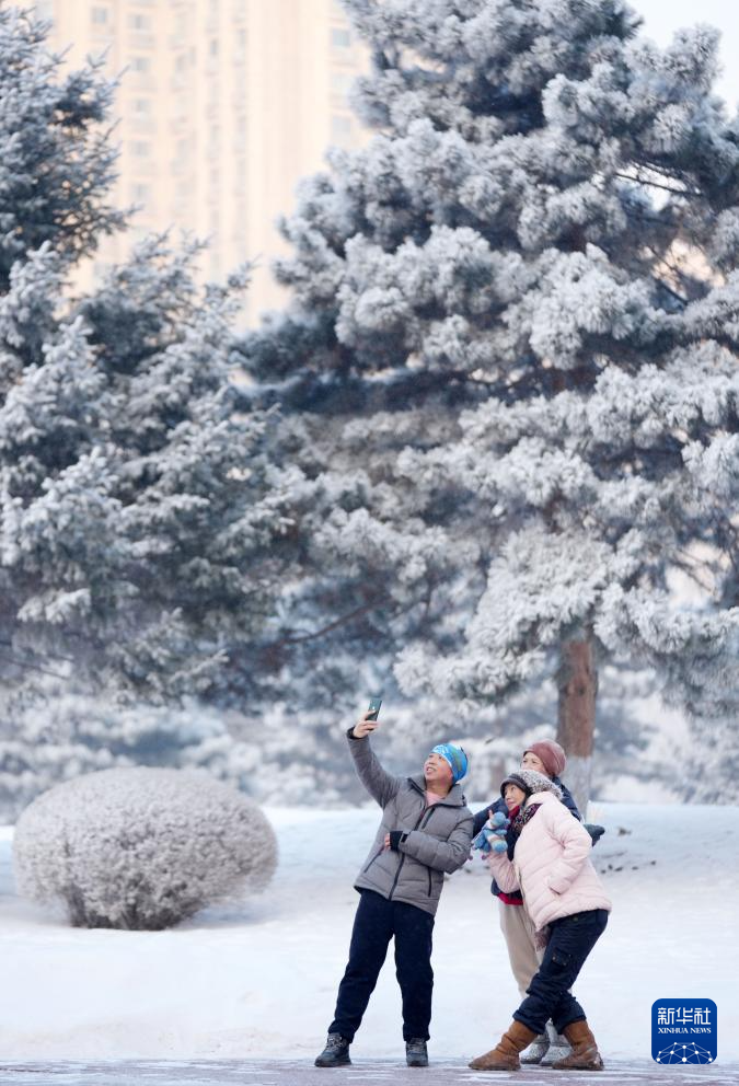 当日,降雪后的冰城哈尔滨市出现雾凇景观,大地银装素裹,玉树琼枝美如画卷。