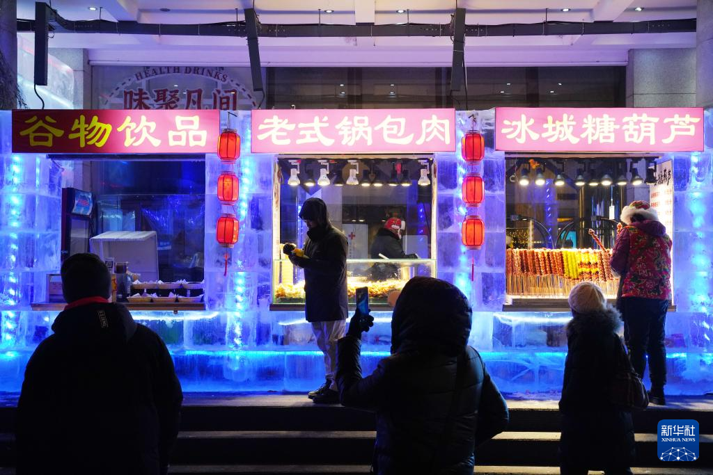 哈尔滨中央大街上的“冰摊位”吸引游客驻足(1月3日摄)。