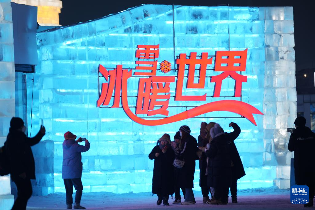 游客在哈尔滨冰雪大世界园区内一面写着“冰雪暖世界”的冰墙前拍照(1月2日摄)。