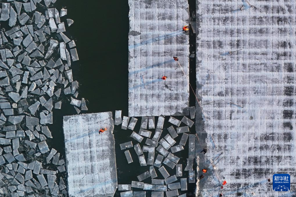 工人在松花江上的采冰现场进行采冰作业(无人机照片,2023年12月4日摄)。