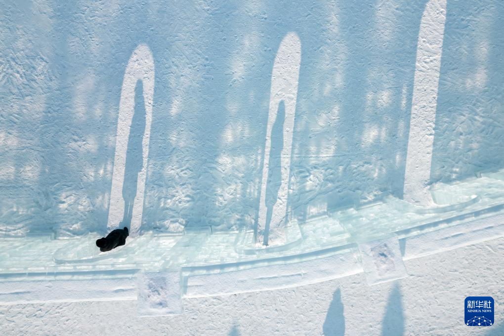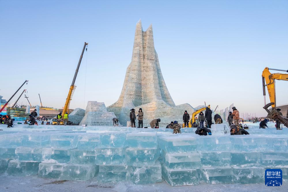 工人在哈尔滨冰雪大世界园区建设现场用冰块搭建冰雪景观(2023年12月14日摄)。