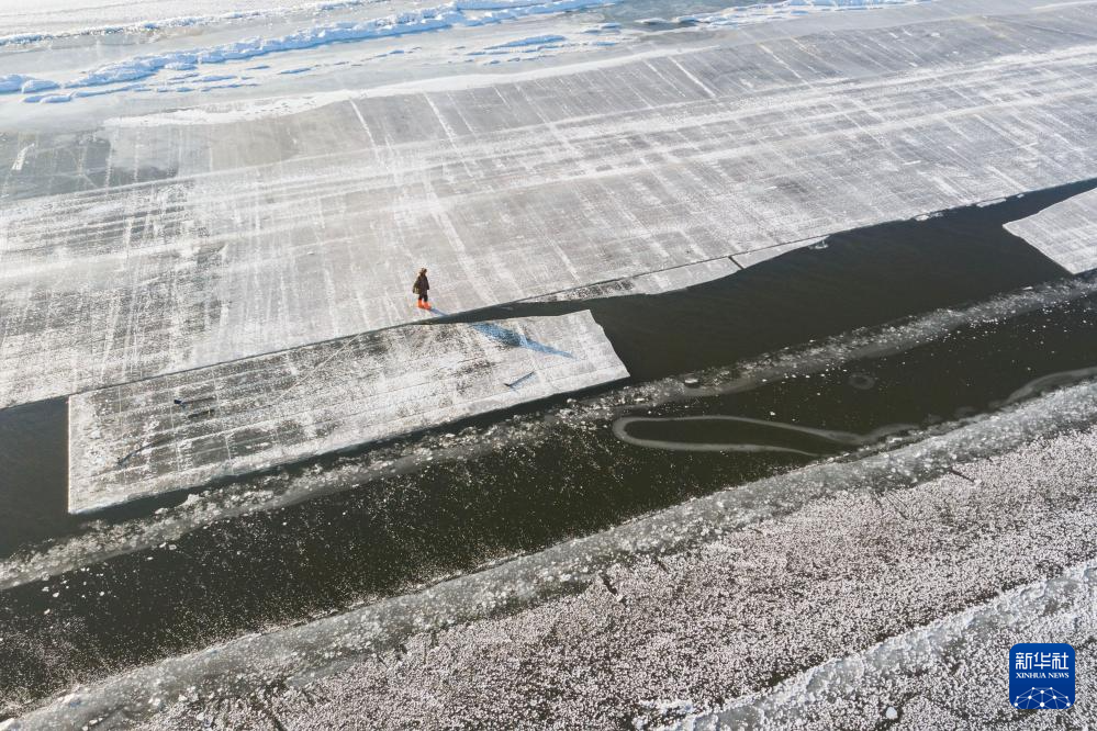在封冻的松花江哈尔滨段江面,采冰工人在进行采冰作业(无人机照片,2023年12月14日摄)。