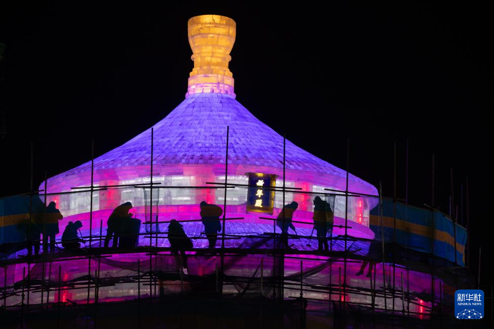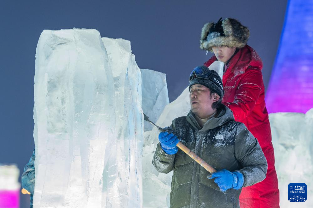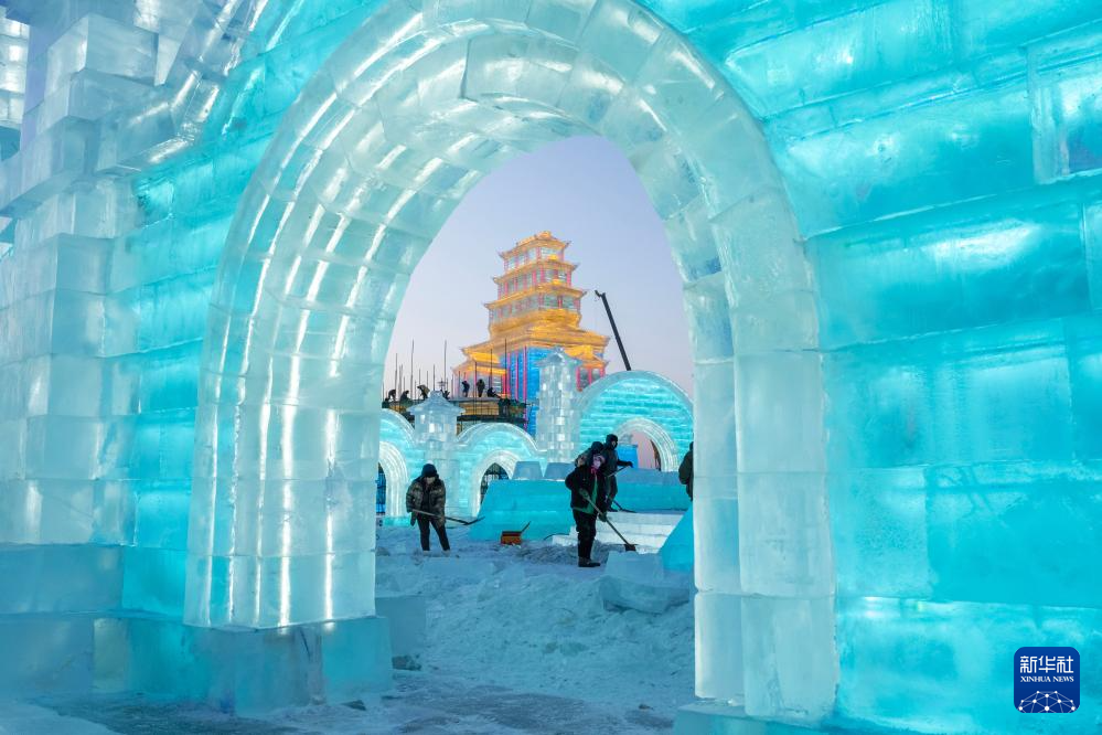在哈尔滨冰雪大世界园区,工作人员在建造冰雕(2023年12月12日摄)。
