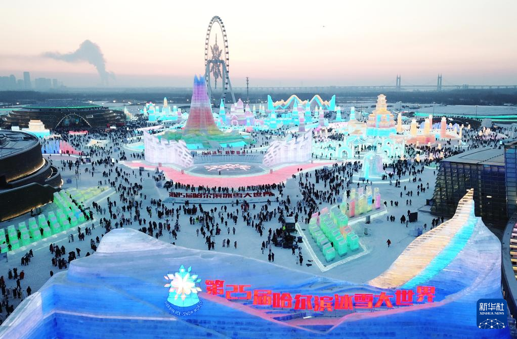 游客在哈尔滨冰雪大世界园区内游玩(无人机照片,2023年12月26日摄)。