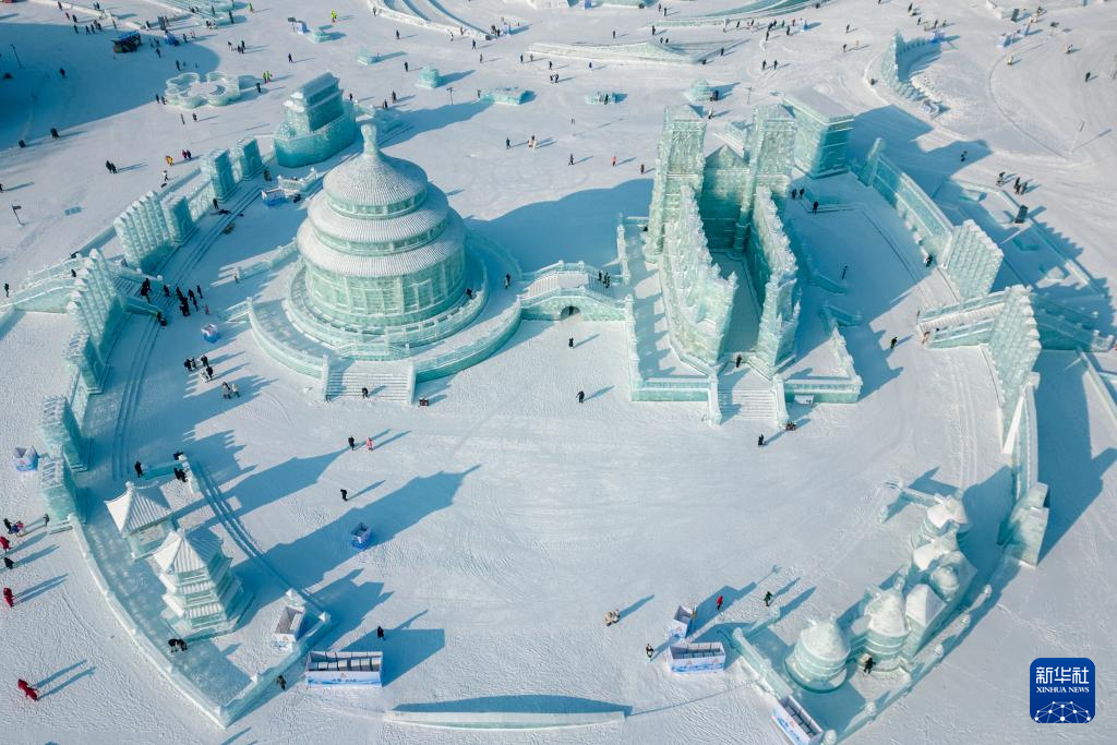 游客和市民在哈尔滨采冰节现场游玩(无人机照片,2023年12月7日摄)。