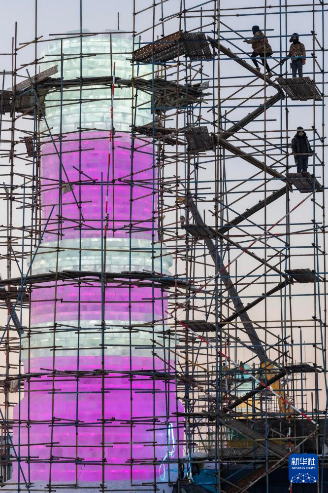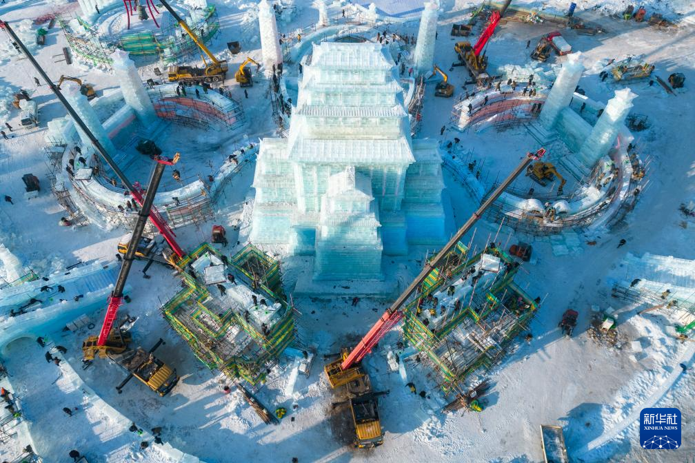 工人在哈尔滨冰雪大世界园区建设现场施工(2023年12月14日摄)。