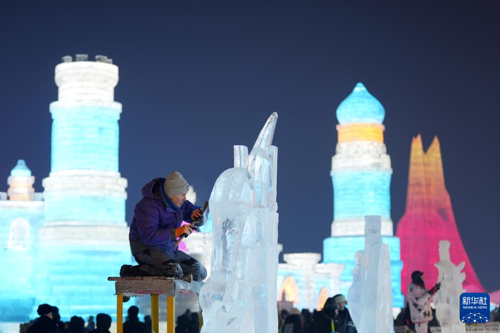 在哈尔滨冰雪大世界园区内,参赛选手在第35届中国·哈尔滨国际冰雕比赛现场进行冰雕创作(1月3日摄)。
