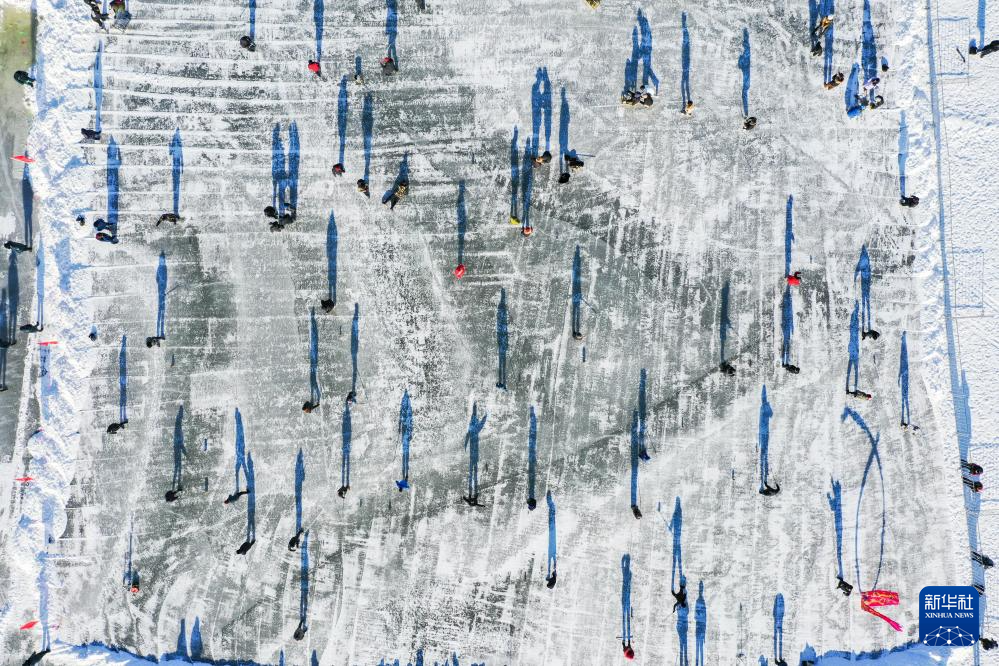 游客在哈尔滨采冰节活动现场体验冰上娱乐项目(无人机照片,2023年12月7日摄)。