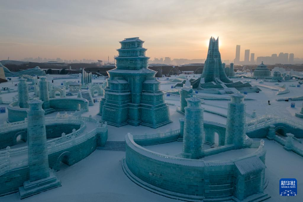 这是1月1日拍摄的清晨时分的哈尔滨冰雪大世界园区(无人机照片)。