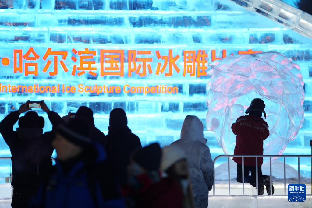 在哈尔滨冰雪大世界园区内举行的第35届中国·哈尔滨国际冰雕比赛现场,选手进行冰雕创作时吸引许多游客驻足观赏(1月2日摄)。