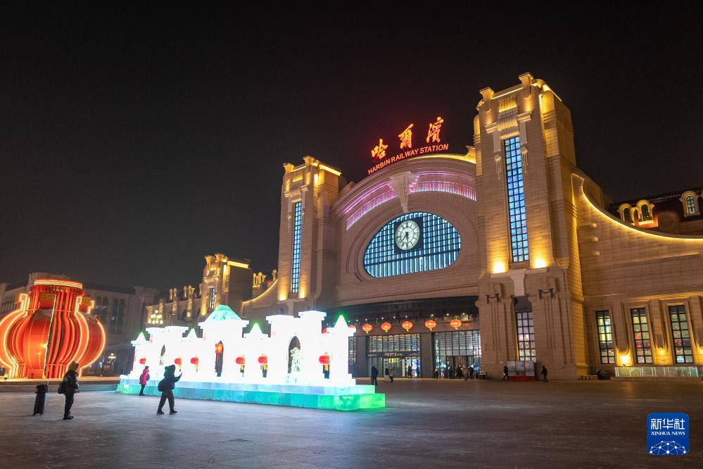 旅客经过哈尔滨站站前广场上的冰雪景观(1月3日摄)。