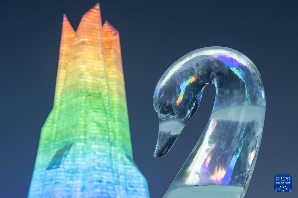 在哈尔滨冰雪大世界园区内,冰雕作品《天鹅》和43米高的主塔“冰雪之冠”交相辉映(1月2日摄)。
