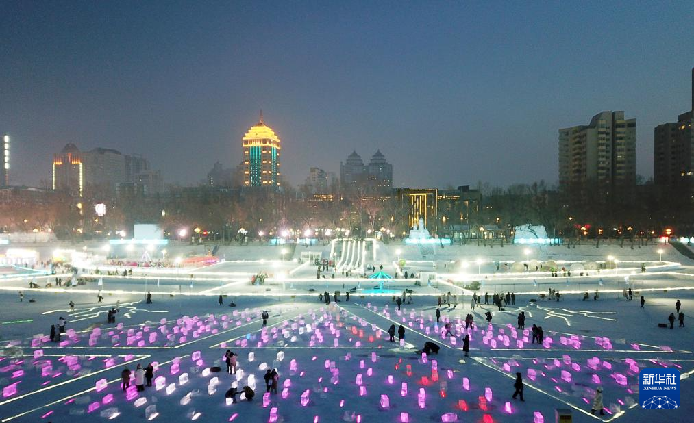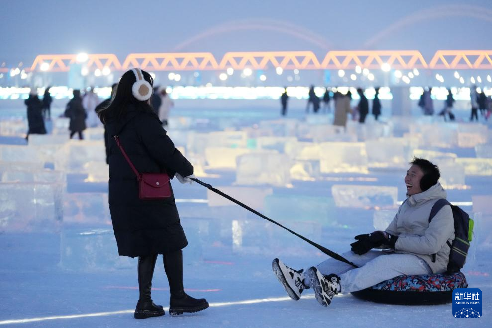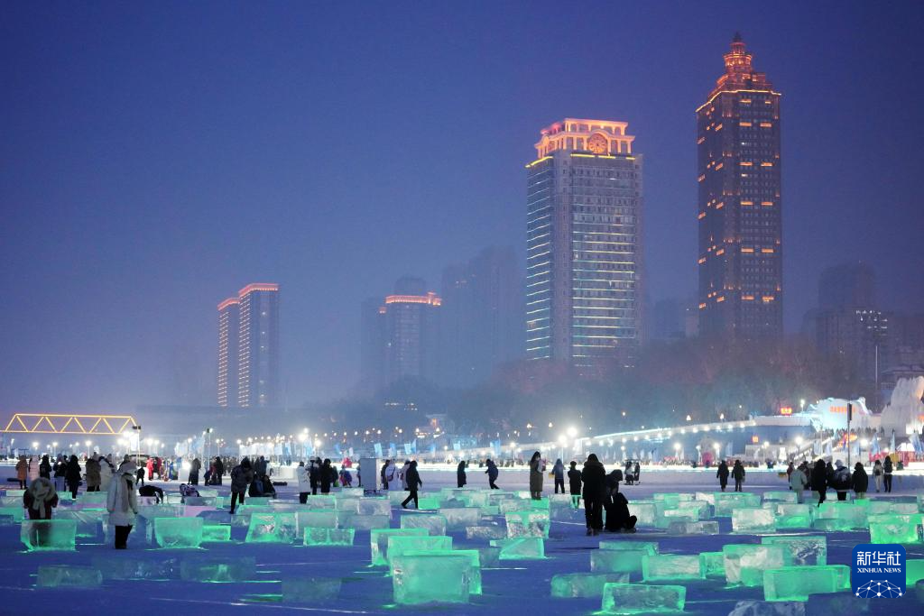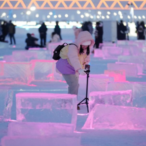 近日,在哈尔滨松花江冰雪嘉年华景区江面上,一处由冰块和灯光组合成的开放式“冰光秀场”亮相,吸引游客前来游玩、拍照。