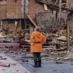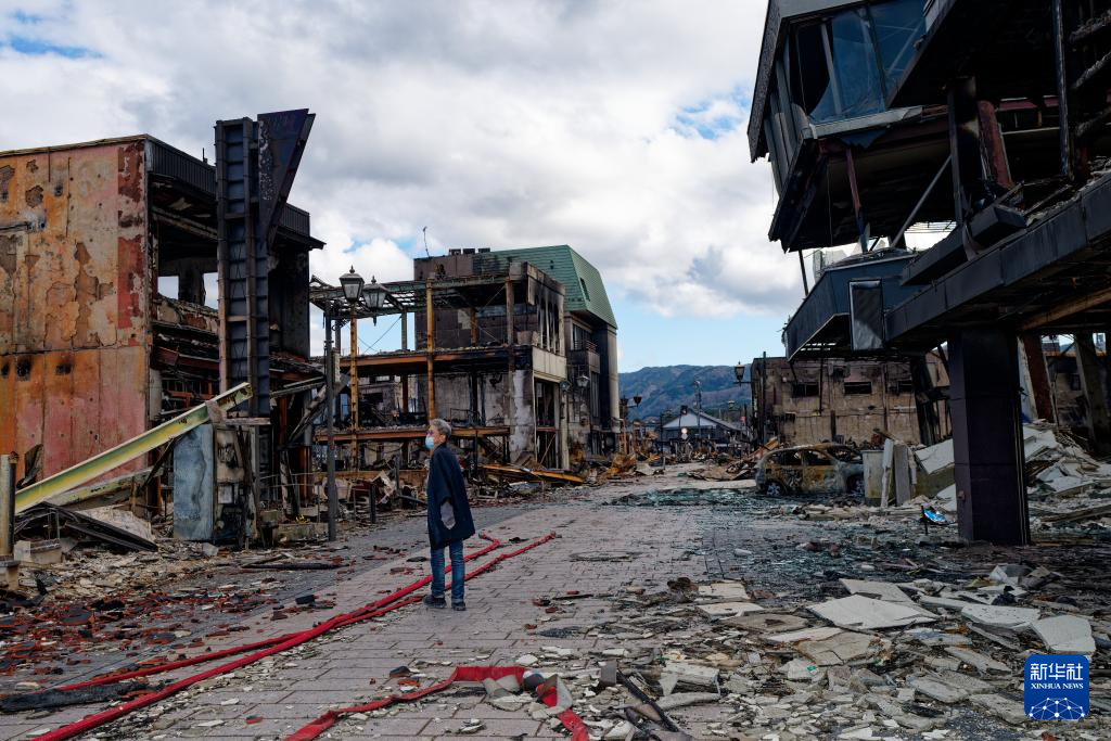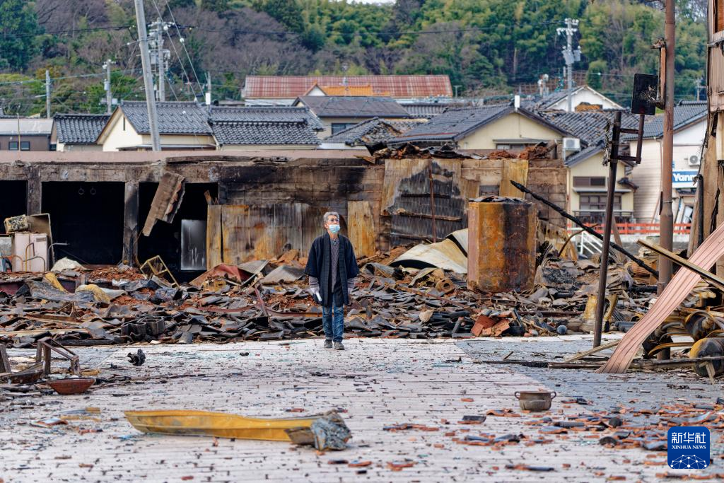 1月4日,一名市民查看日本石川县轮岛市“轮岛早市”废墟。