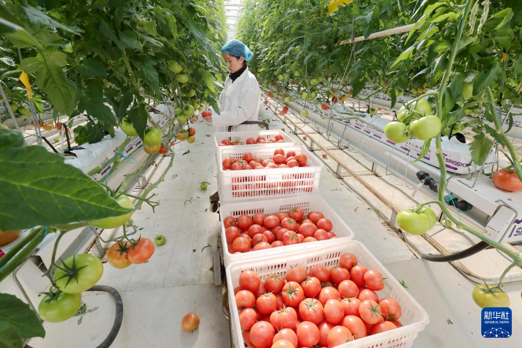 1月5日,在浙江省湖州市德清县阜溪街道龙胜村,工人在温室内采收番茄。