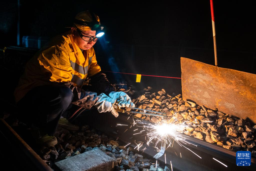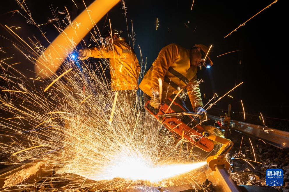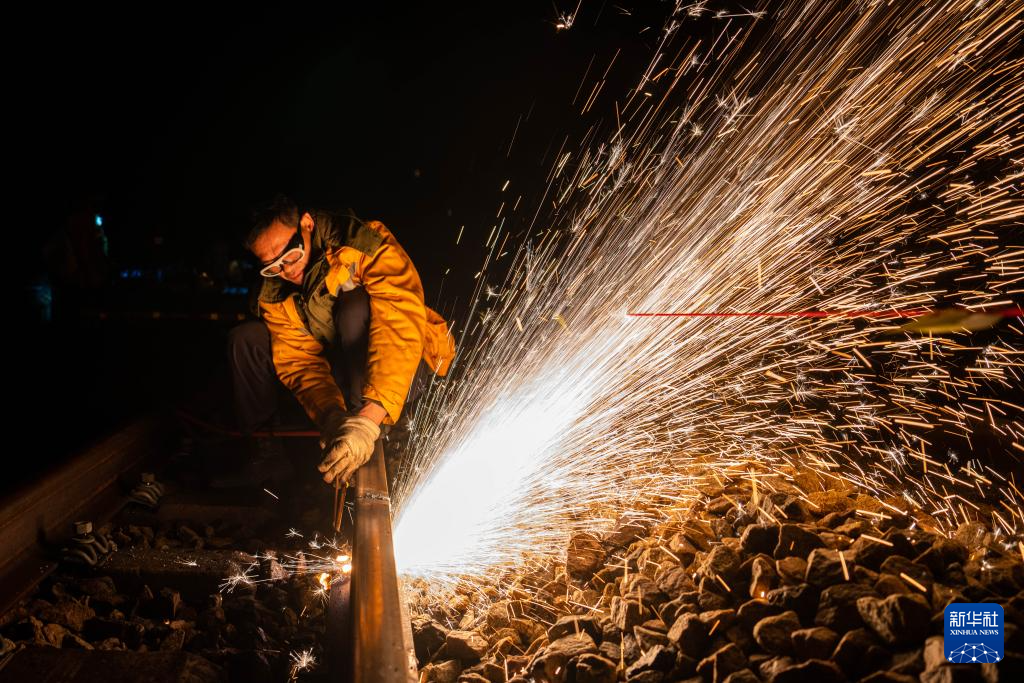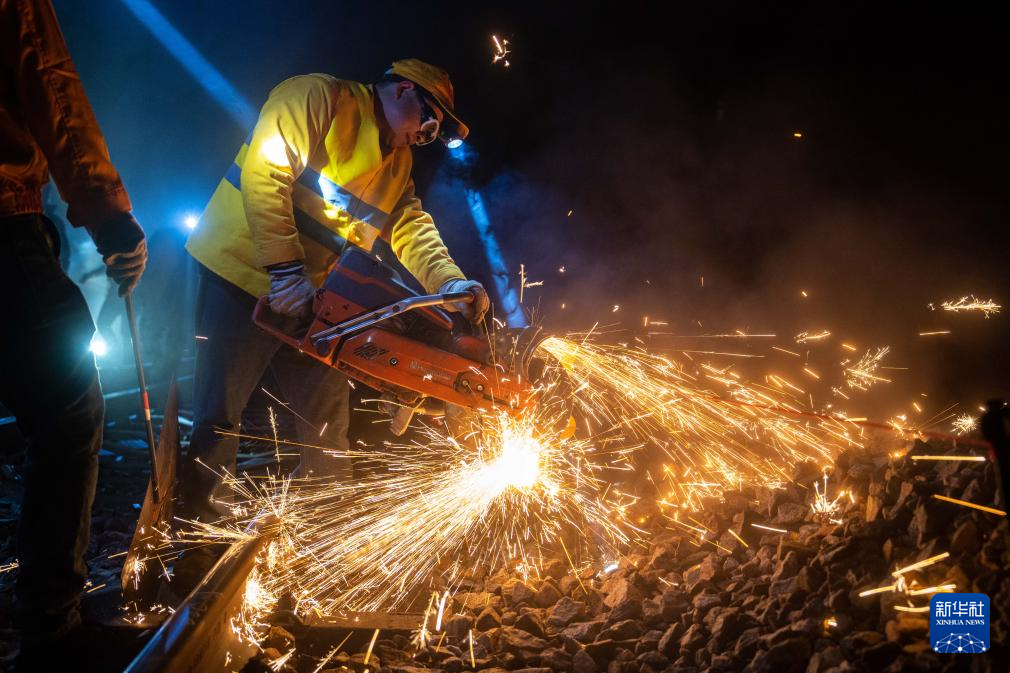 1月5日凌晨,在沪昆铁路公坪至芷江西区间,铁路工人使用切割机进行锯轨作业。