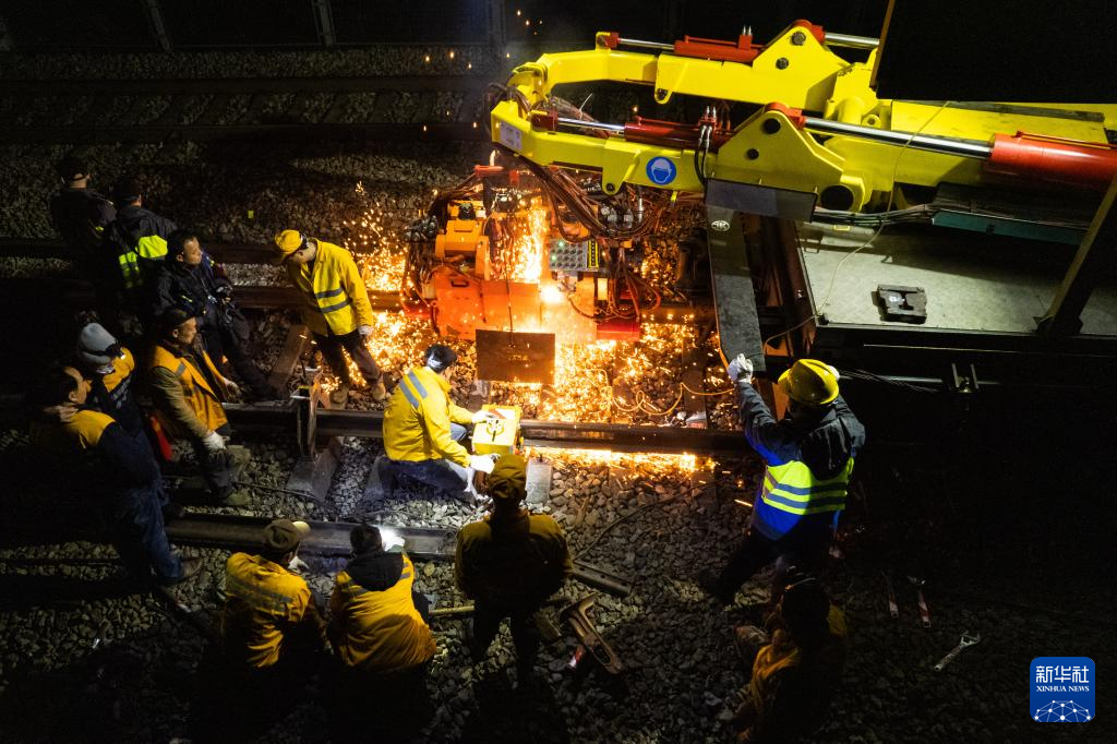 1月5日凌晨,在沪昆铁路公坪至芷江西区间,一辆厢式焊轨车在施工(无人机照片)。