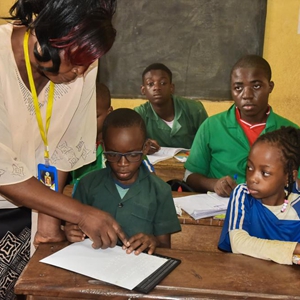 1月4日,在喀麦隆雅温得一所全纳学校里,老师指导学生书写盲文。