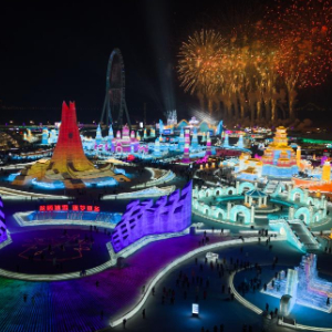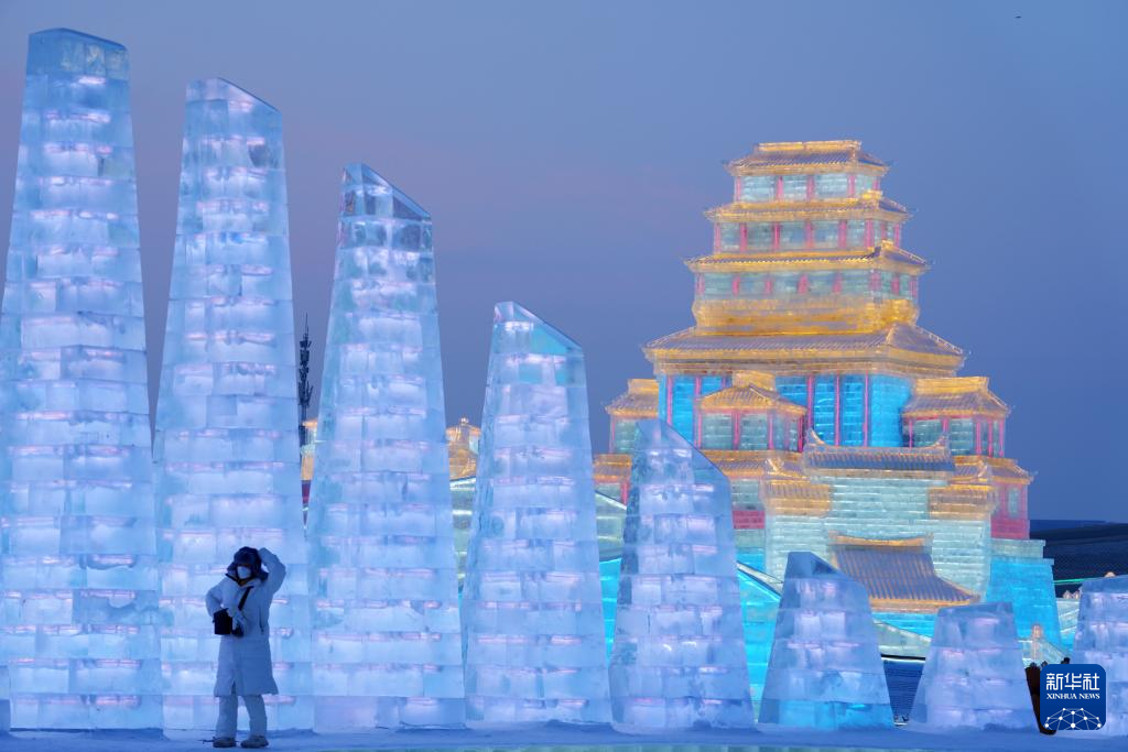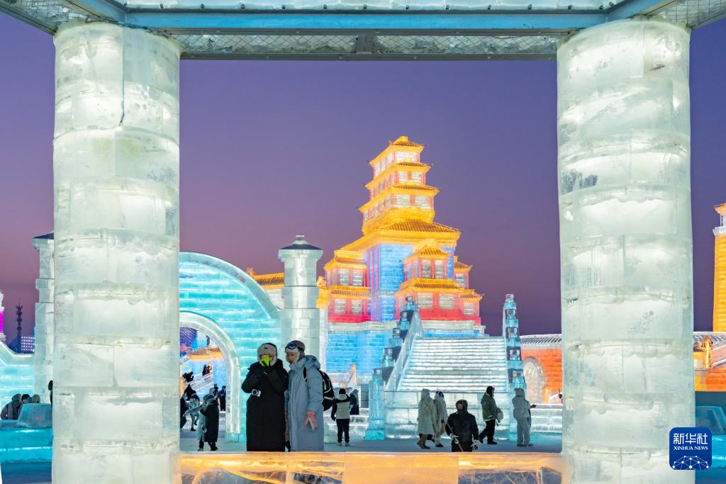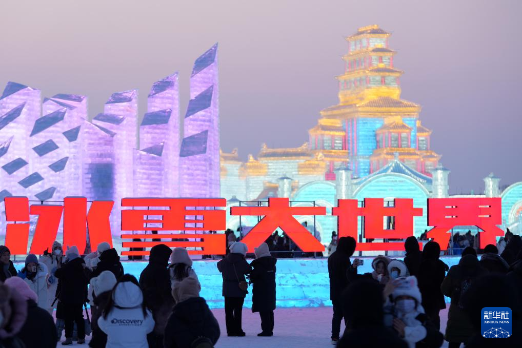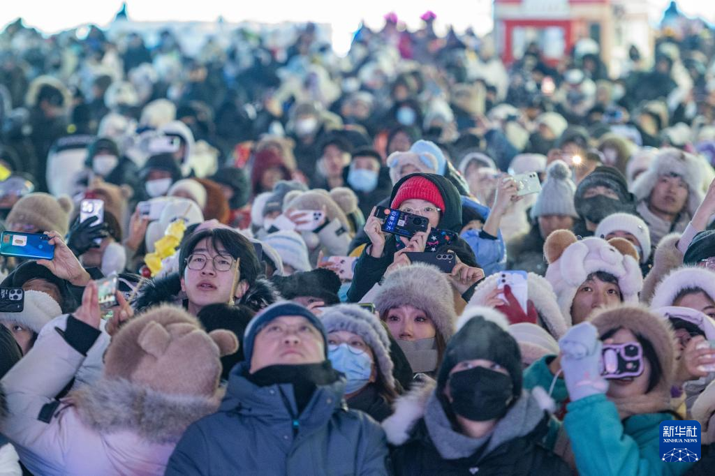 1月5日,在哈尔滨冰雪大世界园区,游客观看第40届中国·哈尔滨国际冰雪节开幕式。