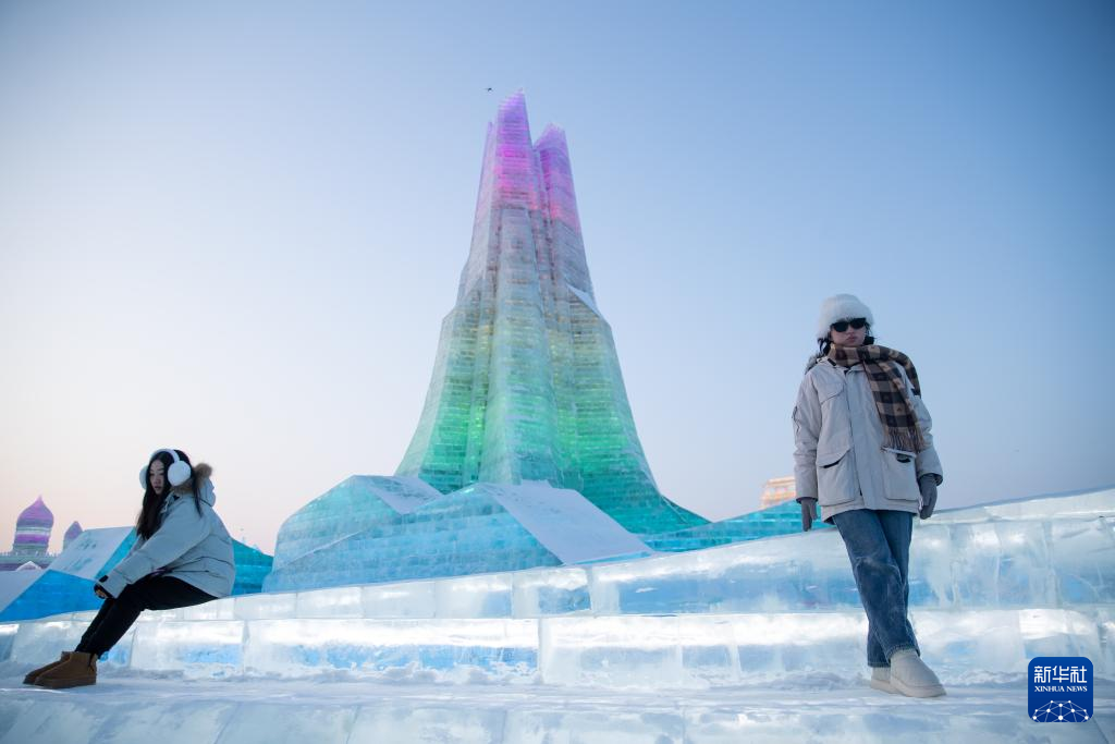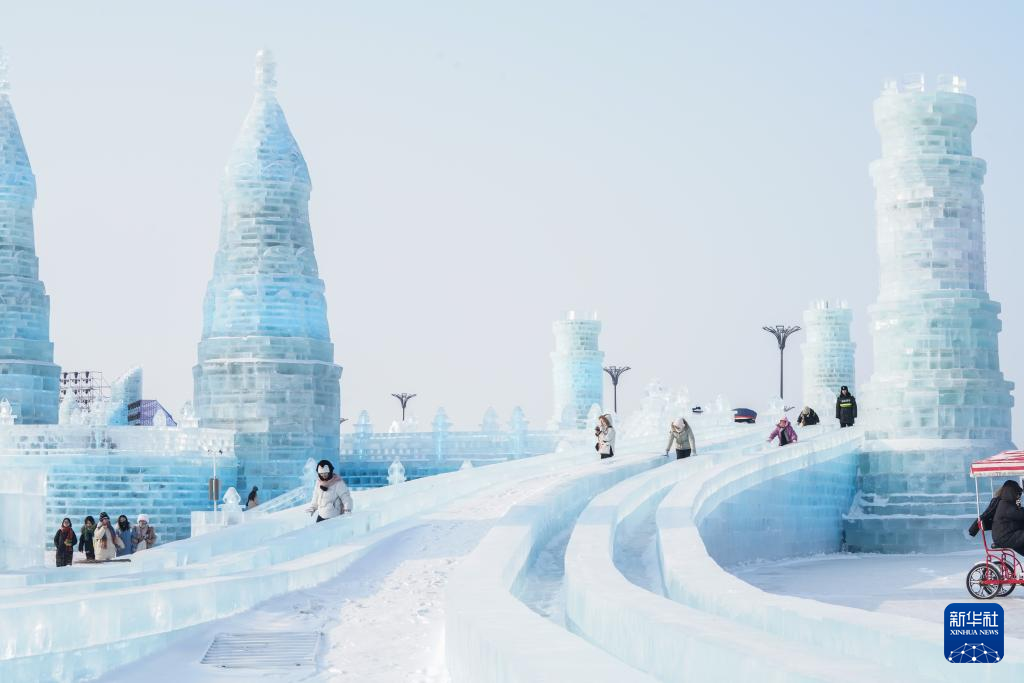 1月5日,游客在哈尔滨冰雪大世界园区游玩。