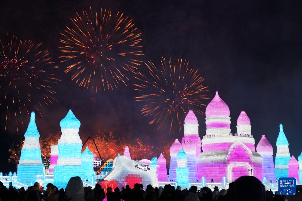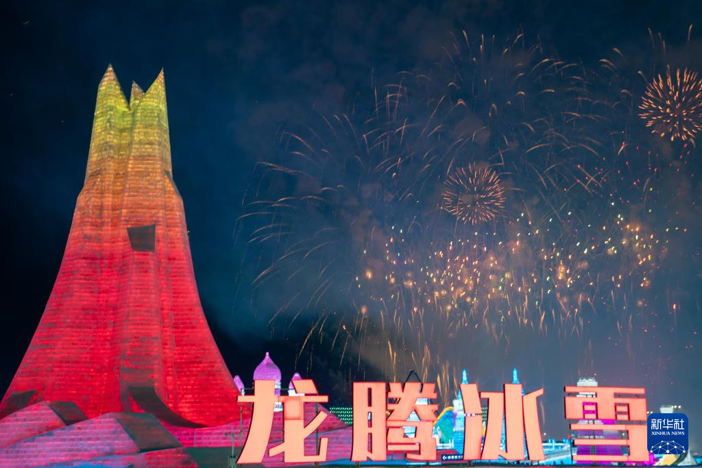 1月5日,冰雪节启幕焰火在哈尔滨冰雪大世界园区上空绽放。