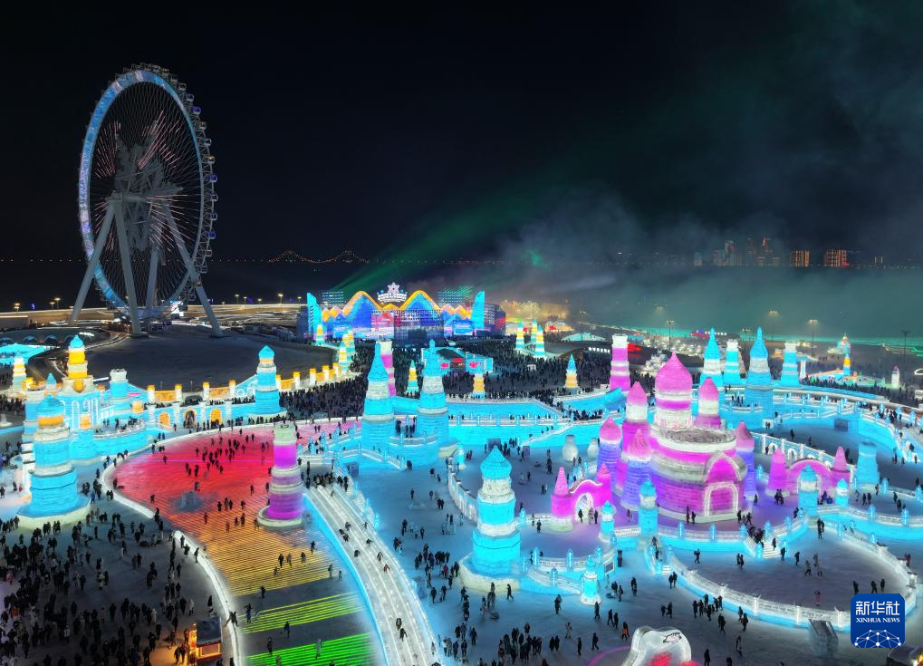 1月5日,游客在哈尔滨冰雪大世界园区内游玩(无人机照片)。