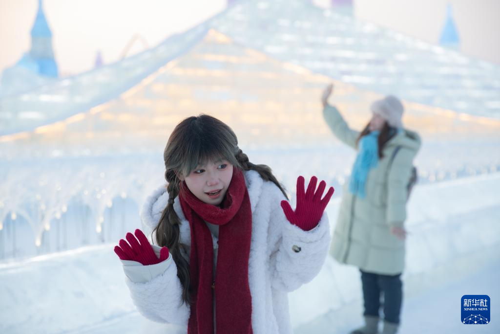 1月5日,游客在哈尔滨冰雪大世界园区内拍照。