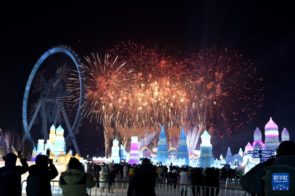 1月5日,在哈尔滨冰雪大世界园区,游客在观看哈尔滨国际冰雪节开幕式上的焰火表演。