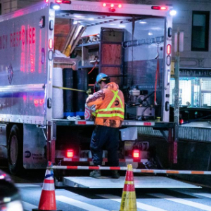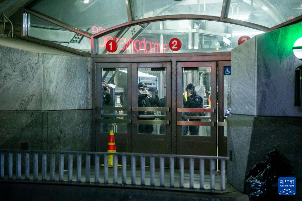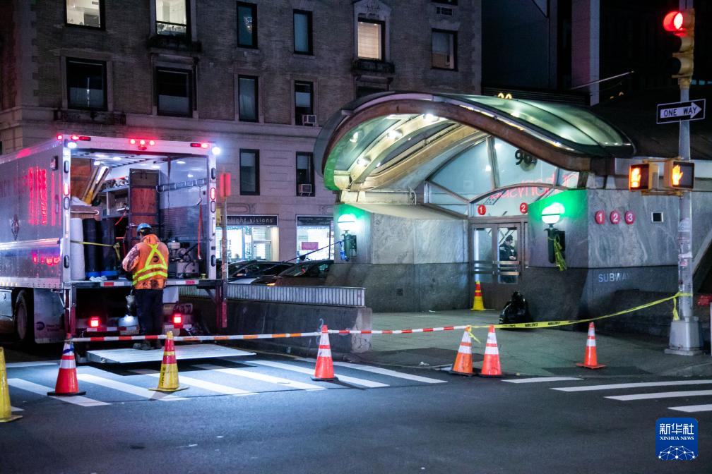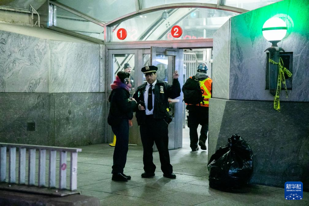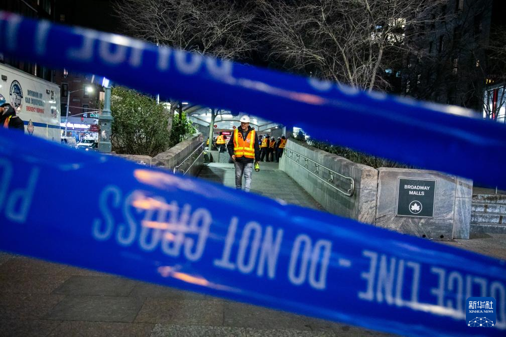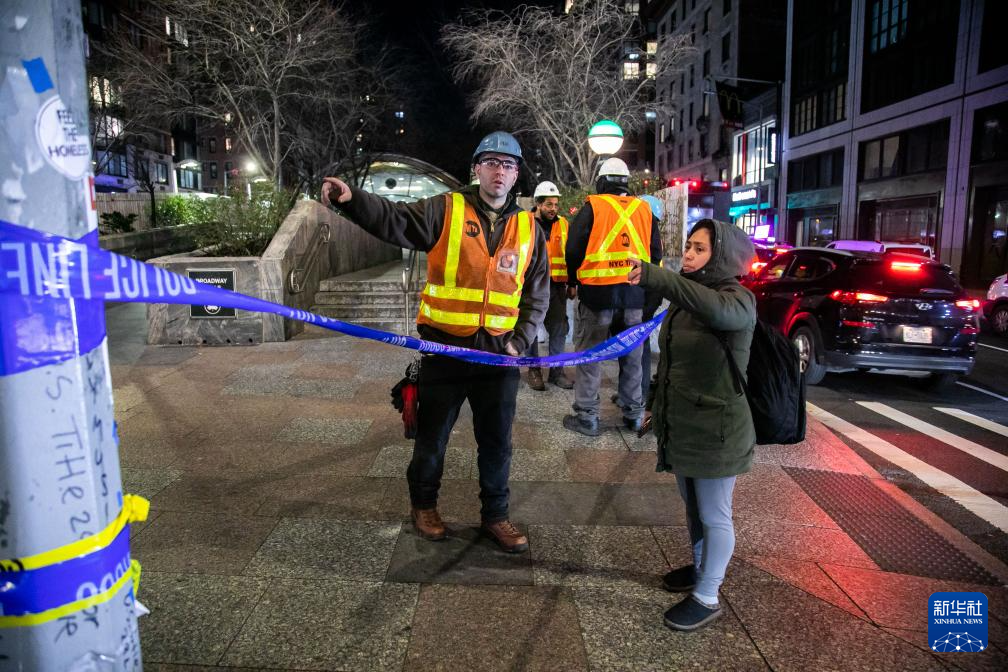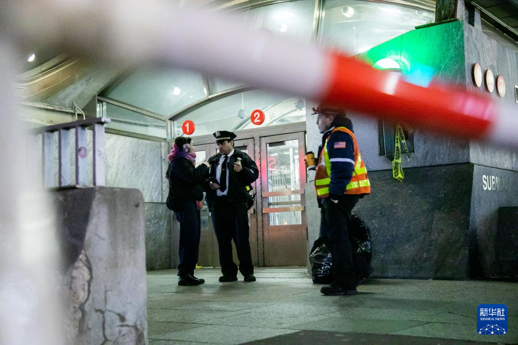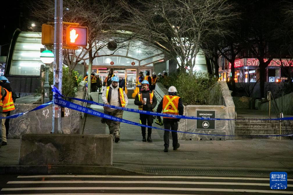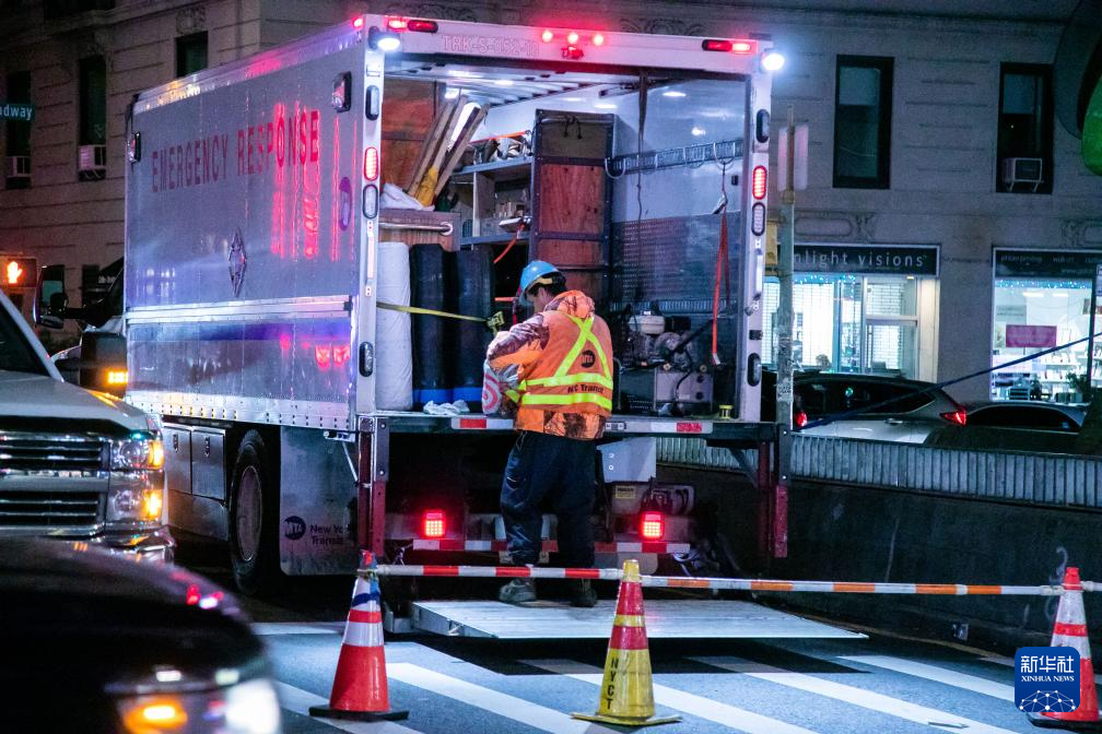 1月4日,在美国纽约,工作人员在列车脱轨事故现场外工作。