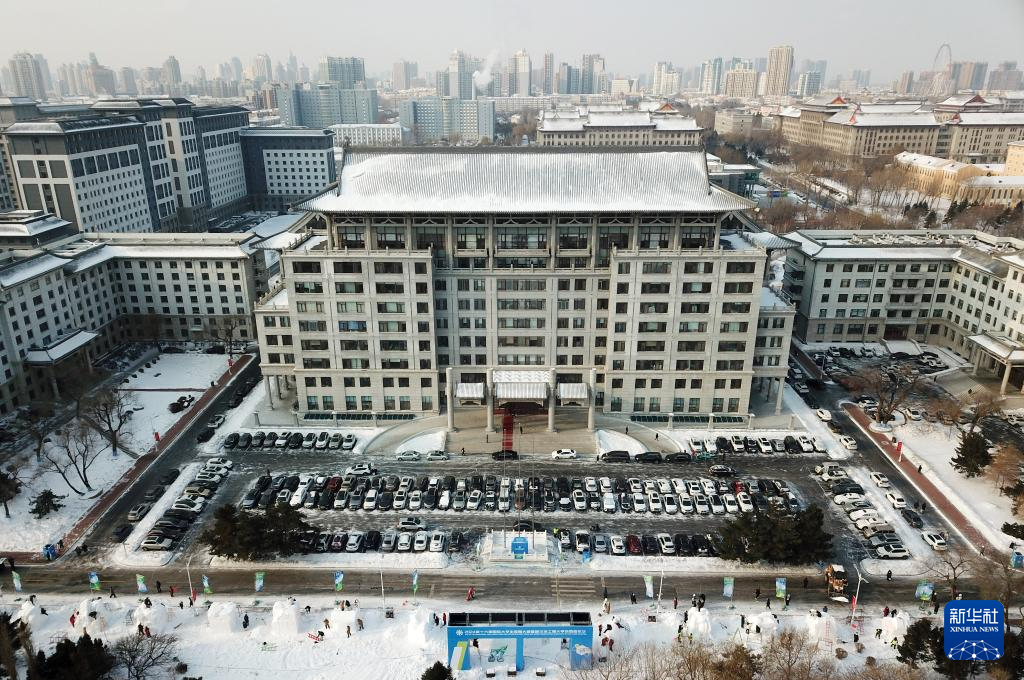 1月5日,在哈尔滨工程大学校园内,选手在创作雪雕(无人机照片)。