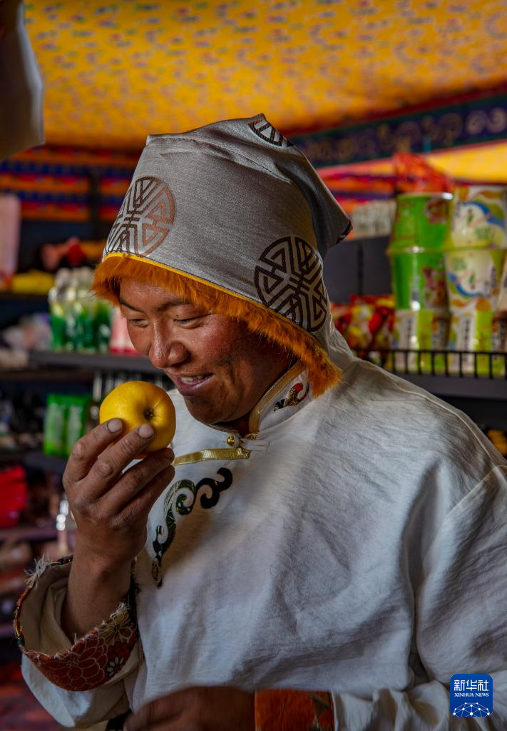 申扎县马跃乡贝嘎四村偏远乡镇果蔬配送试点项目直销点店主西热加措拿起供销合作社配送来的水果(1月5日摄)。