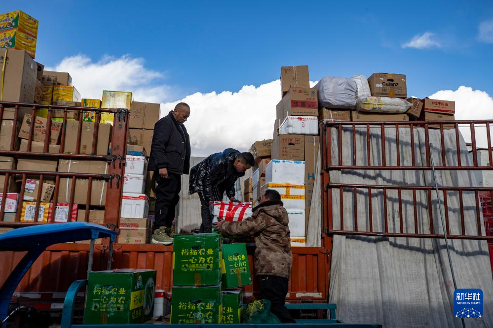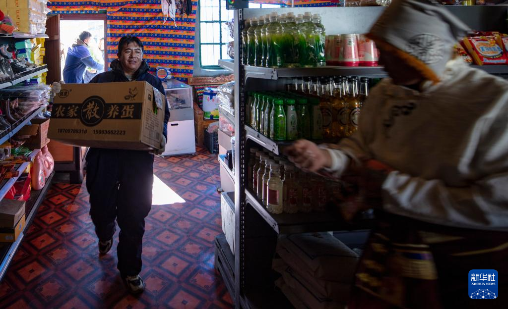 申扎县供销合作社的配送员次仁桑珠在县城总店为马跃乡贝嘎四村偏远乡镇果蔬配送试点项目直销点上货(1月5日摄)。