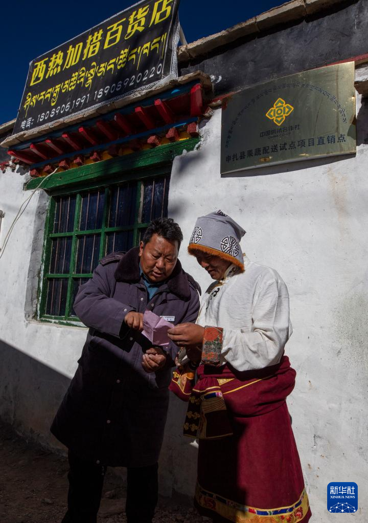 申扎县供销合作社的配送负责人吴瓦(左)与马跃乡贝嘎四村偏远乡镇果蔬配送试点项目直销点店主西热加措核对配送清单(1月5日摄)。