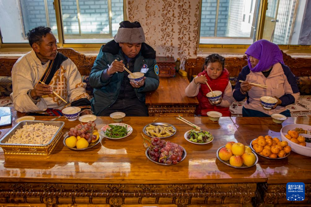 申扎县马跃乡贝嘎四村村民次仁曲达(左一)家在吃饭,桌上的新鲜蔬菜和水果都是在村里的偏远乡镇果蔬配送试点项目直销点采购的,由供销合作社当天配送而来(1月5日摄)。