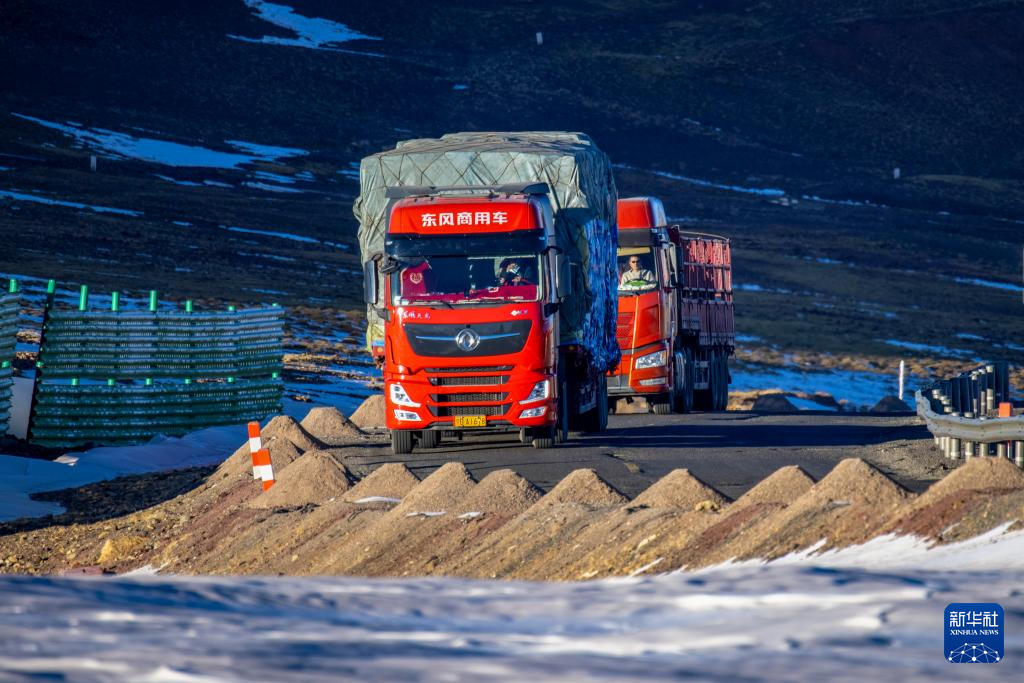 运载着申扎县供销合作社为偏远乡镇果蔬配送试点项目从西宁采购的50吨新鲜果蔬的货车经过唐古拉山口(1月3日摄)。