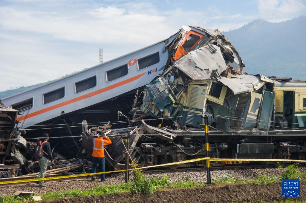2024年1月5日,在印度尼西亚西爪哇省,工作人员在列车相撞事故现场工作。