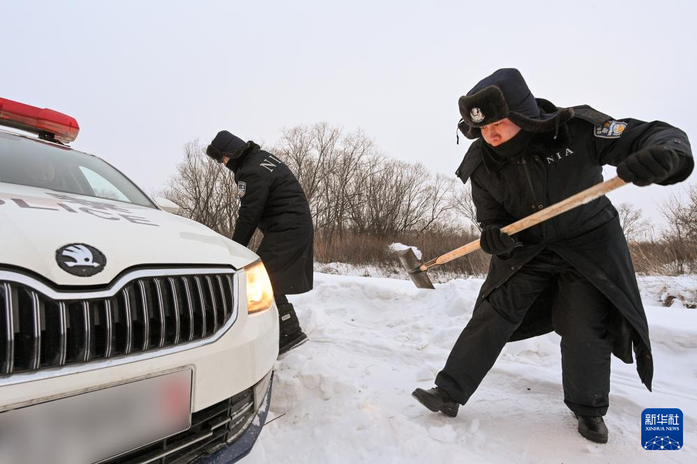 1月5日,黑瞎子岛边境派出所民警于瀚森(右)、张鑫铲除积雪以使巡逻警车脱困。