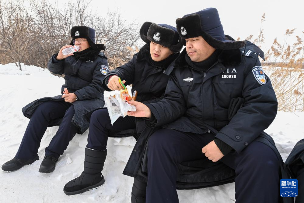 1月5日,黑瞎子岛边境派出所民警李华、张鑫、徐旭(从左至右)在巡逻过程中吃午饭。