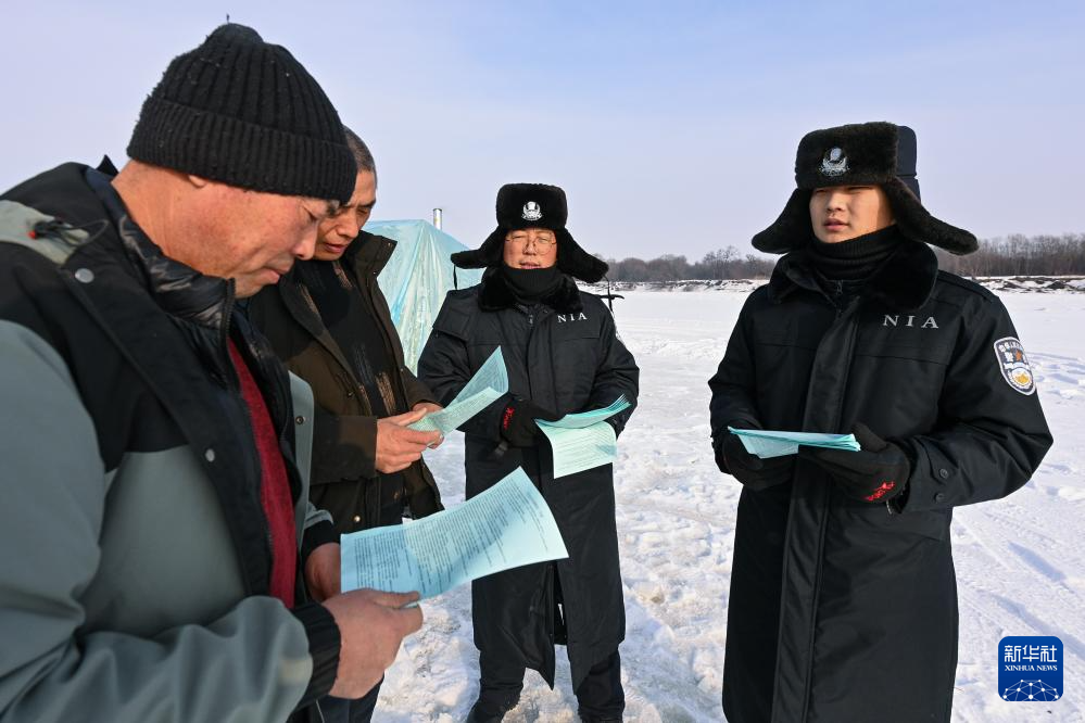 1月5日,黑瞎子岛边境派出所民警李华、张鑫(右)在巡逻过程中向民众宣传边境管理法规。