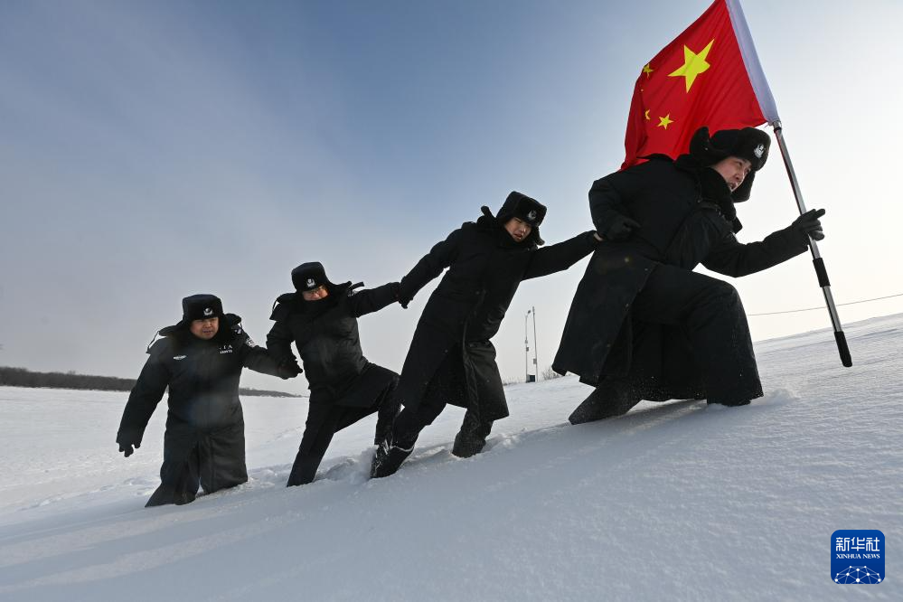 1月5日,黑瞎子岛边境派出所民警于瀚森、张鑫、李华、徐旭(从前至后)在封冻的江面上步行巡逻。