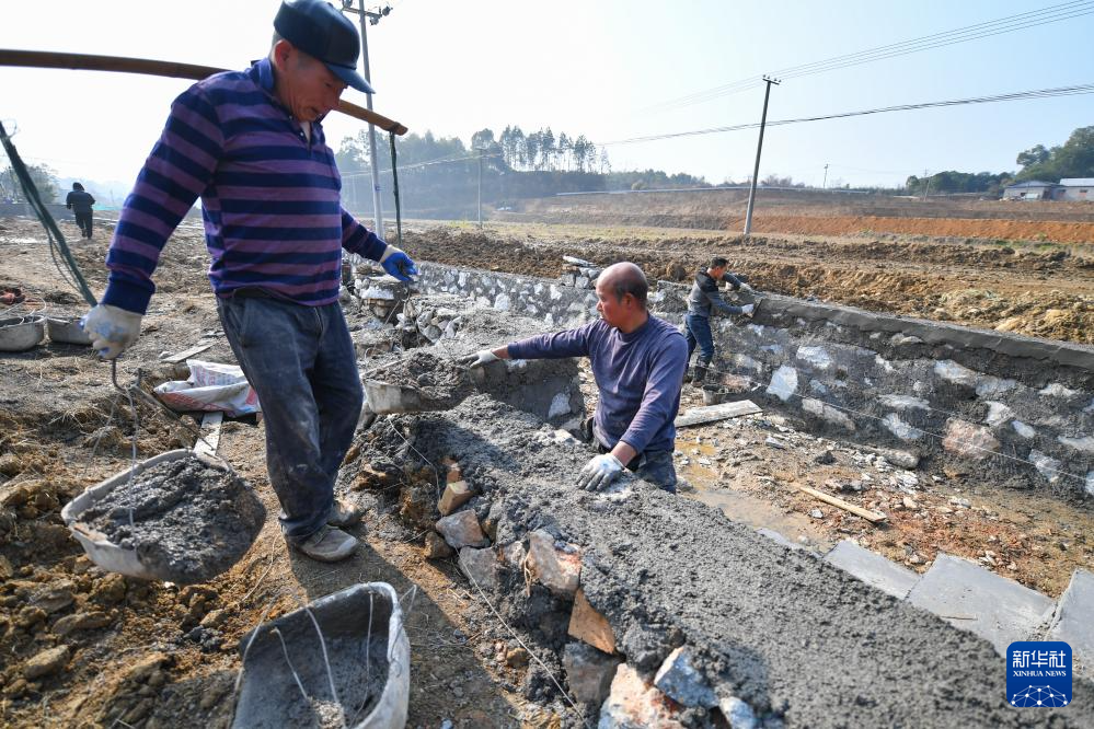 1月6日,在湘潭市雨湖区鹤岭镇双丰村,工人在进行高标准农田建设施工。