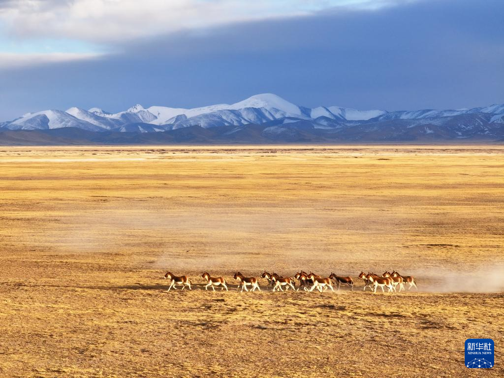 在阿尔金山国家级自然保护区,一群藏野驴在奔跑(无人机照片,2023年12月21日摄)。