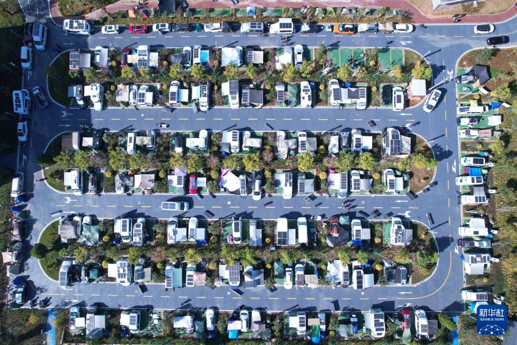 1月7日,位于金沙江边的云南省昭通市巧家县栗喉蜂虎房车营地,停满了来自全国各地的各式房车(无人机照片)。