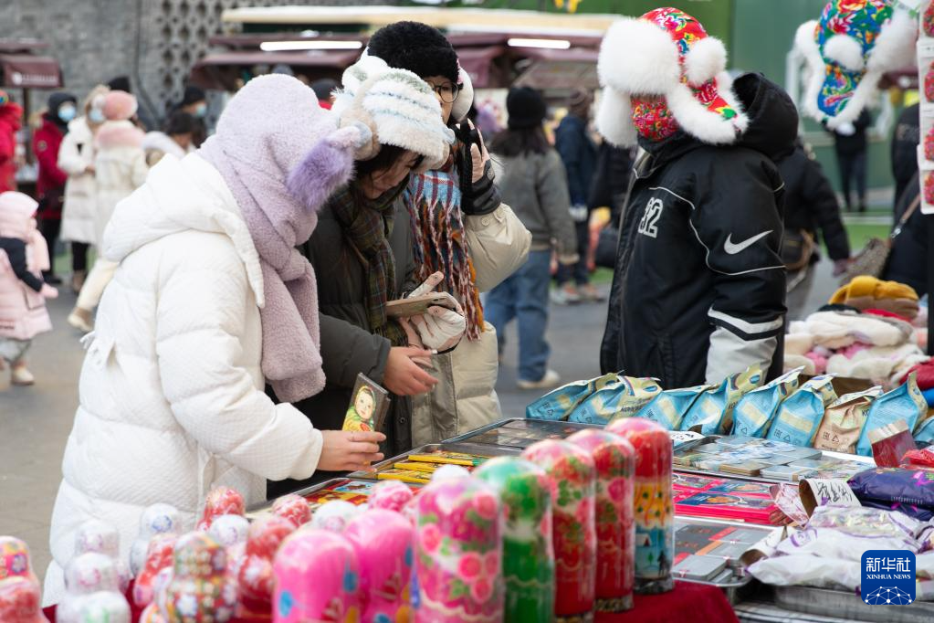 1月8日,游客在哈尔滨市道外区中华巴洛克历史文化街区内选购纪念品。