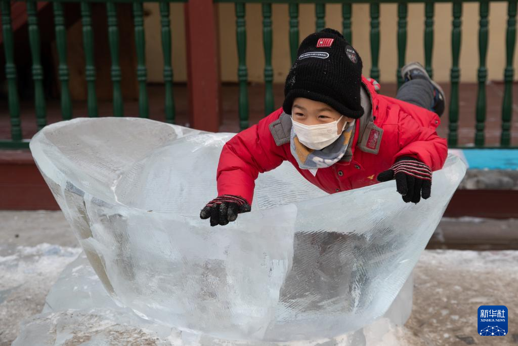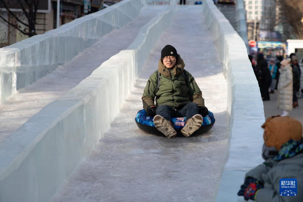 1月8日,游客在哈尔滨市道外区中华巴洛克历史文化街区内玩冰滑梯。